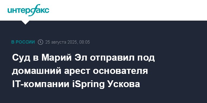 Москва. 25 августа. INTERFAX.RU - Йошкар-Олинский городской суд избрал меру пресечения основателю и директору IT-компании iSpring Юрию Ускову в виде домашнего ареста, сообщает телеграм-канал судов республики Марий Эл.