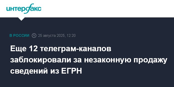 Москва. 25 августа. INTERFAX.RU - Еще 12 телеграм-каналов заблокировали с начала года за незаконную продажу выписок из Единого государственного реестра недвижимости (ЕГРН), сообщили в пресс-службе Росреестра.