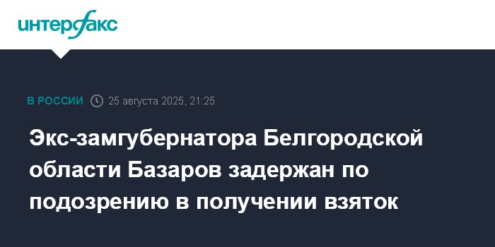 Москва. 25 августа. INTERFAX.RU - Правоохранители задержали бывшего заместителя губернатора Белгородской области Владимира Базарова по подозрению в хищении свыше 250 млн рублей при строительстве оборонительных сооружений в регионе, сообщили в пресс-центре МВД России.