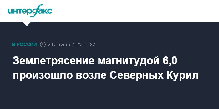 Москва. 26 августа. INTERFAX.RU - Землетрясение магнитудой 6,0 зарегистрировано во вторник утром в Тихом океане возле Северных Курил в Сахалинской области, сообщили "Интерфаксу" в Камчатском филиале Единой геофизической службы РАН.