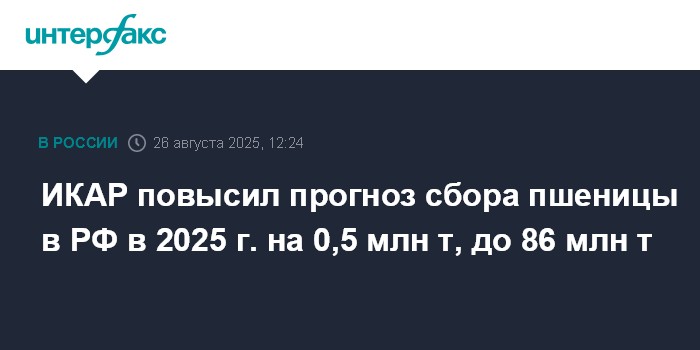 Москва. 26 августа. INTERFAX.RU - Институт конъюнктуры аграрного рынка (ИКАР) в очередной раз повысил прогноз сбора пшеницы в РФ и ее экспортного потенциала на текущий сельхозгод (июль 2025-июнь 2026 гг.).