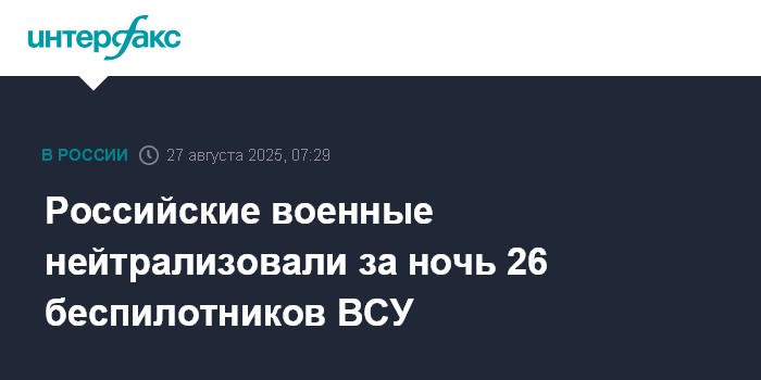 Москва. 27 августа. INTERFAX.RU - В течение прошедшей ночи дежурными средствами ПВО перехвачено и уничтожено 26 украинских беспилотных летательных аппаратов самолетного типа, сообщили в министерстве обороны РФ.