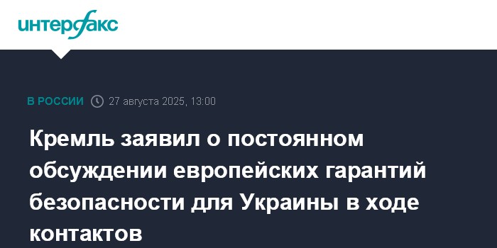 Москва. 27 августа. INTERFAX.RU - Возможные гарантии безопасности для Украины со стороны Европы являются постоянным предметом обсуждения на переговорах по украинскому урегулированию, заявил пресс-секретарь президента РФ Дмитрий Песков.