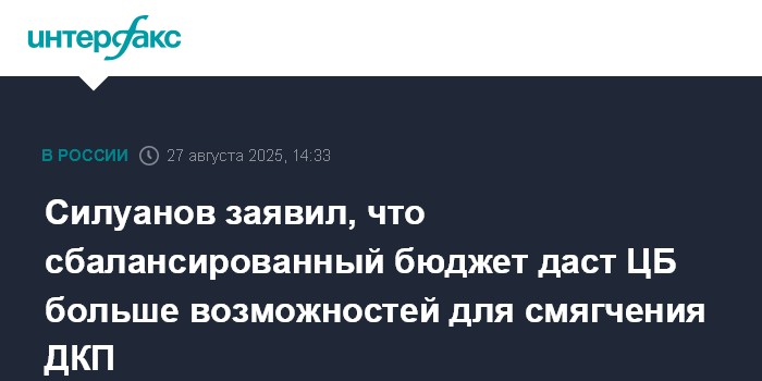 Москва. 27 августа. INTERFAX.RU - Сбалансированный бюджет даст Банку России больше возможностей для смягчения денежно-кредитной политики, что внесет дополнительный импульс в экономическое развитие в 2026 году, считает министр финансов Антон Силуанов.