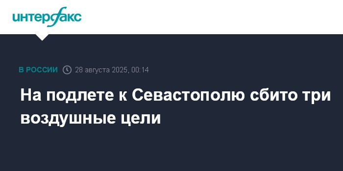 Москва. 28 августа. INTERFAX.RU - Средствами ПВО уничтожено три воздушные цели над Черным морем у Севастополя, сообщил губернатор Михаил Развожаев.