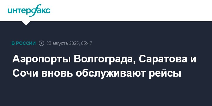 Москва. 28 августа. INTERFAX.RU - Ограничения на прием и выпуск воздушных судов сняты в аэропортах Волгограда, Саратова (Гагарин) и Сочи, сообщили в Росавиации.