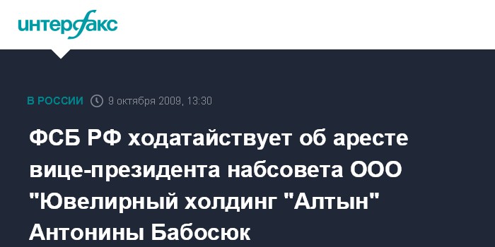 ФСБ РФ ходатайствует об аресте вице-президента набсовета ООО "Ювелирный холдинг "Алтын" Антонины Бабосюк
