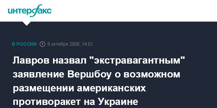 Москва. 9 октября. INTERFAX.RU - Министр иностранных дел России Сергей Лавров удивлен заявлением замминистра обороны США Александр Вершбоу о возможном включении Украины в зону размещения американских ракет "Пэтриот". "Это заявление является экстравагантным и достаточно неожиданным", - сказал Лавров, отвечая в пятницу на один из вопросов журналистов в Кишиневе, отметив, что от Вершбоу "постоянно звучат заявления, которые создают больше вопросов, чем дают ответов".