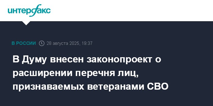 Москва. 28 августа. INTERFAX.RU - Правительство РФ внесло в Госдуму законопроект, расширяющий перечень лиц, которых могут признавать ветеранами СВО, предлагается включить в него участников штурмовых подразделений, служивших с осени 2022 г. по осень 2023 г.