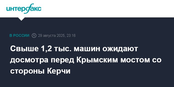 Москва. 29 августа. INTERFAX.RU - В очереди на досмотр перед въездом на Крымский мост со стороны Керчи скопилось более 1 тыс. 200 автомобилей, сообщили в ночь на субботу в инфоцентре, освещающем ситуацию на автомобильных подходах к мосту.