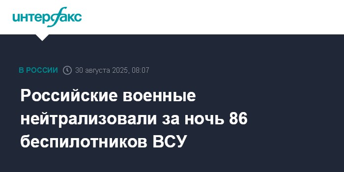 Москва. 30 августа. INTERFAX.RU - Минобороны РФ сообщило, что с 21:00 пятницы до 7:00 субботы было перехвачено и уничтожено 86 украинских беспилотников над десятью российскими регионами и Черным морем.