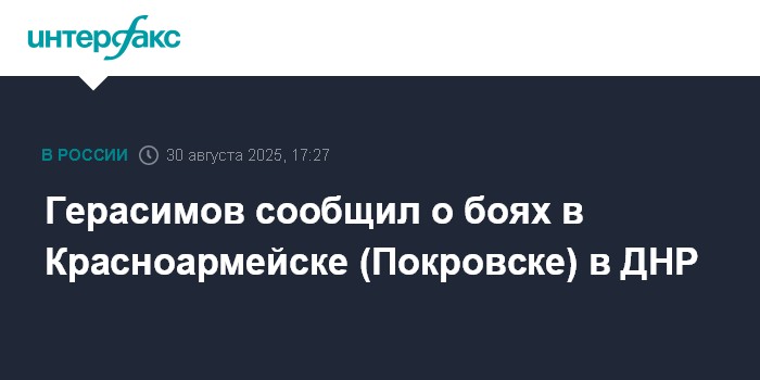 Москва. 30 августа. INTERFAX.RU - Начальник Генштаба РФ Валерий Герасимов заявил, что российские войска ведут бои с ВСУ в городе Красноармейск Донецкой Народной Республики.