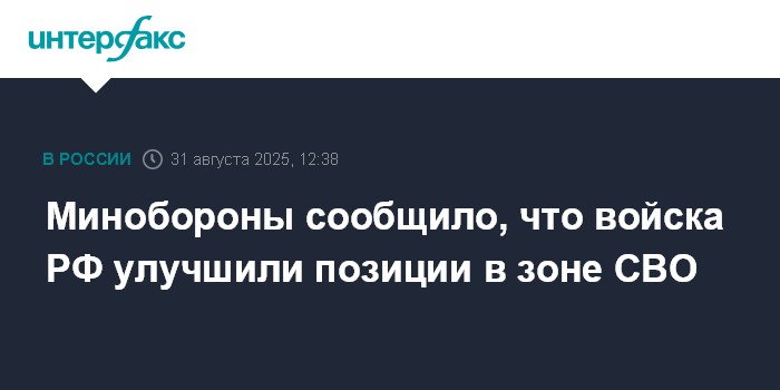 Москва. 31 августа. INTERFAX.RU - Группировки войск "Запад", "Южная" и "Центр" улучшили позиции в зоне спецоперации, "Восток" продвигается вглубь украинской обороны, сообщило Минобороны РФ в воскресенье.