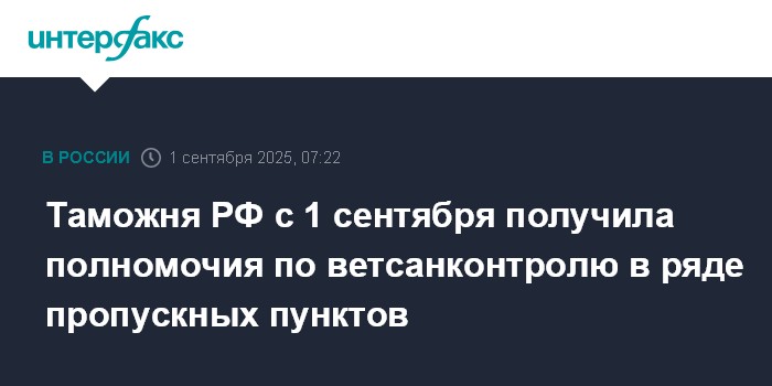 Москва. 1 сентября. INTERFAX.RU - Таможенные органы РФ с 1 сентября 2025 года получили полномочия по проведению федерального государственного ветеринарного и карантинного фитосанитарного контроля (надзора), а также санитарно-карантинного контроля в ряде пропускных пунктов на госгранице.