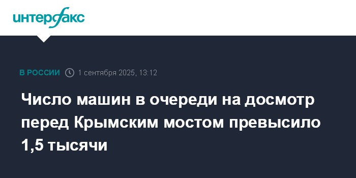 Москва. 1 сентября. INTERFAX.RU - Число машин перед досмотровыми пунктами на Крымском мосту превысило 1,5 тысячи в понедельник днем, 1,2 тысячи из них - со стороны Краснодарского края, сообщили в инфоцентре, освещающем ситуацию на автомобильных подходах к мосту.