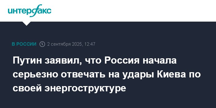 Москва. 2 сентября. INTERFAX.RU - Россия долго не реагировала на украинские удары по своей энергетической структуре, но затем начала серьезно отвечать, заявил президент РФ Владимир Путин.