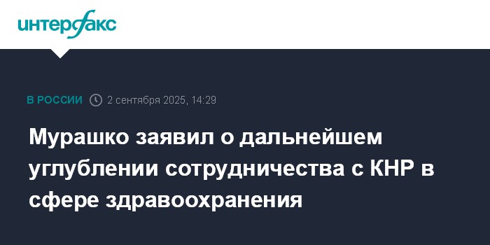 Москва. 2 сентября. INTERFAX.RU - Россия и Китай будут углублять взаимовыгодное сотрудничество в сфере здравоохранения по всем основным направлениям, сообщил министр здравоохранения РФ Михаил Мурашко.