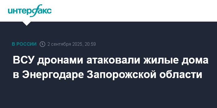 Москва. 2 сентября. INTERFAX.RU - ВСУ нанесли несколько ударов беспилотниками по жилой застройке города Энергодара, в котором расположена Запорожская АЭС, сообщил во вторник глава горадминистрации Максим Пухов.