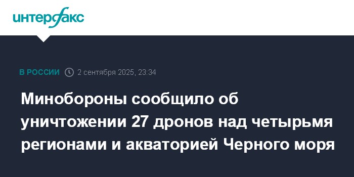 Москва. 2 сентября. INTERFAX.RU - Вечером вторника над российскими регионами уничтожено 27 украинских беспилотников, сообщило Минобороны РФ.