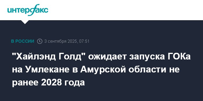 "Хайлэнд Голд" ожидает запуска ГОКа на Умлекане в Амурской области не ранее 2028 года