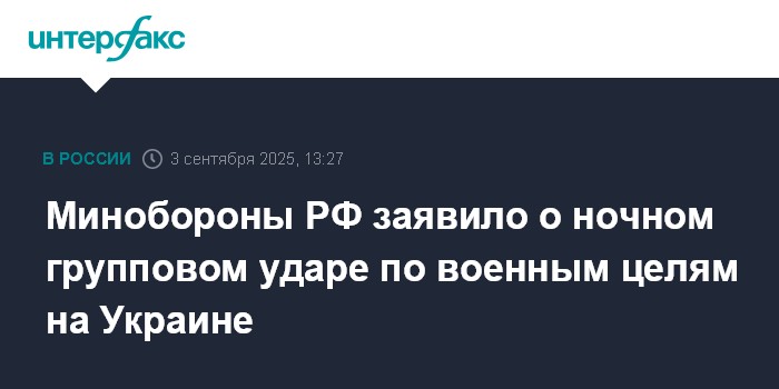 Москва. 3 сентября. INTERFAX.RU - Российские военные ночью нанесли групповой удар по военным целям на Украине, поражены предприятия ВПК и объекты топливной инфраструктуры, которые использовались ВСУ, сообщили в Минобороны РФ в среду.