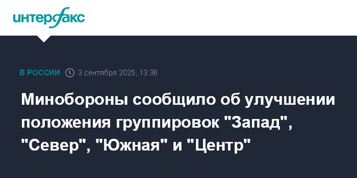 Москва. 3 сентября. INTERFAX.RU - Группировки войск "Запад", "Север", "Южная" и "Центр" за сутки улучшили положение в зоне спецоперации, группировка "Восток" продвинулась в глубину украинской обороны, сообщили в Минобороны РФ в среду.