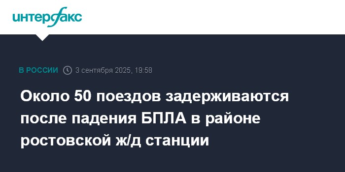 Москва. 3 сентября. INTERFAX.RU - Порядка 50 поездов идут с задержками до 4 часов из-за падения обломков БПЛА в районе станции Кутейниково в Ростовской области, сообщается в телеграм-канале РЖД.