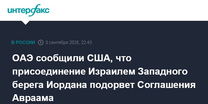 Москва. 3 сентября. INTERFAX.RU - ОАЭ предупредили США, что в случае присоединения Израилем Западного берега реки Иордан реализация Соглашений Авраама о нормализации отношений между Израилем и рядом арабских стран окажется под вопросом, сообщает Axios со ссылкой на источники.
