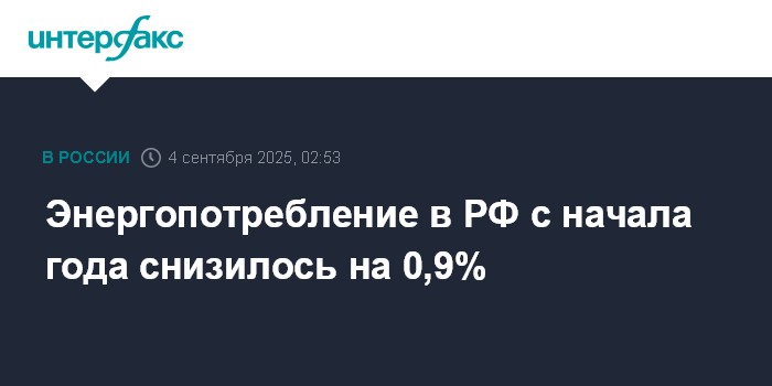Москва. 4 сентября. INTERFAX.RU - Энергопотребление в РФ с начала 2025 г. снизилось на 0,9% к аналогичному периоду прошлого года, сообщил журналистам предправления "Системного оператора" Федор Опадчий в кулуарах ВЭФ-2025.