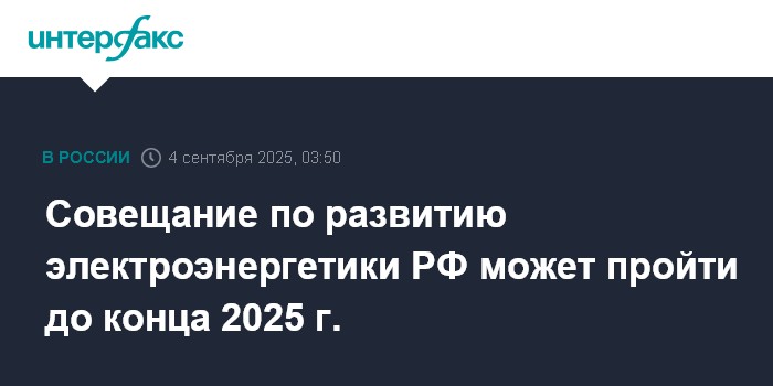 Москва. 4 сентября. INTERFAX.RU - Совещание по развитию электроэнергетики РФ может пройти до конца 2025 г., сообщил в ходе ВЭФ-2025 министр энергетики РФ Сергей Цивилев.