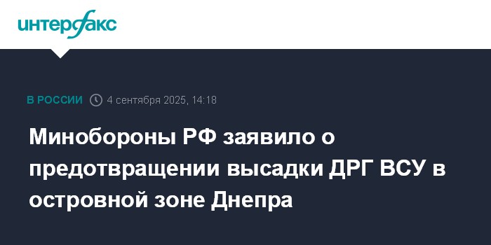 Москва. 4 сентября. INTERFAX.RU - Российские военные предотвратили попытку высадки украинской диверсионно-разведывательной группы (ДРГ) в островной зоне Днепра, сообщили в Минобороны РФ.