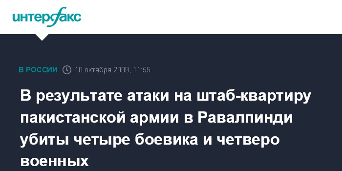 Москва. 10 октября. INTERFAX.RU - Четыре вооруженных боевика убиты при попытке атаковать штаб-квартиру пакистанской армии в Равалпинди близ Исламабада, сообщают пакистанские СМИ со ссылкой на заявление местных властей.