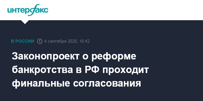 Москва. 4 сентября. INTERFAX.RU - Законопроект о реформе института банкротства в РФ проходит последние согласования, планируется, что до конца года он поступит в Госдуму, заявил глава Минэкономразвития Максим Решетников.