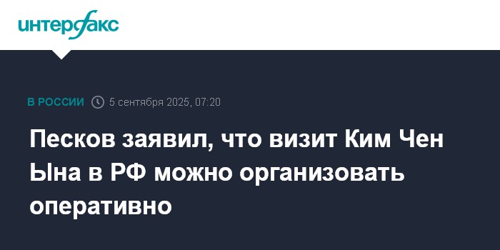 Москва. 5 сентября. INTERFAX.RU - Визит лидера КНДР Ким Чен Ына в Россию можно организовать оперативно, но пока нет точных дат, это будет согласовываться, заявил пресс-секретарь президента РФ Дмитрий Песков "Интерфаксу".