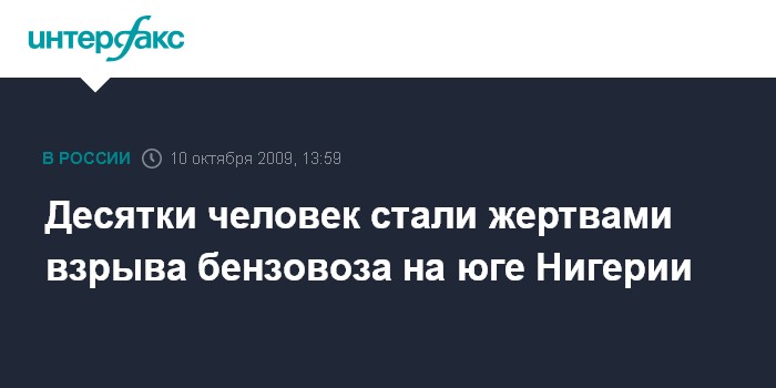 Москва. 10 октября. INTERFAX.RU - Около 80 человек погибли во время взрыва бензовоза на одной из дорог штата Анамбра на юге Нигерии, сообщили в субботу местные СМИ.