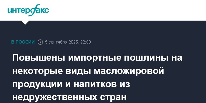 Москва. 5 сентября. INTERFAX.RU - Правительство РФ повысило импортные пошлины на некоторые виды масложировой продукции и напитков из недружественных стран. Соответствующее постановление подписано 30 августа 2025 года и размещено на официальном портале правовой информации.