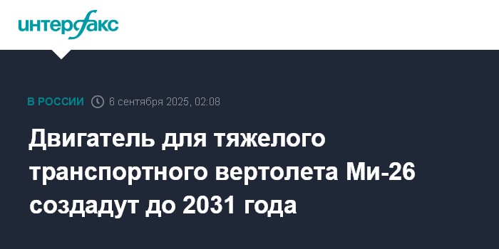Москва. 6 сентября. INTERFAX.RU - Работу над двигателем для тяжелого транспортного вертолета Ми-26 планируют завершить к 2031 году, написал губернатор Самарской области, председатель комиссии Госсовета РФ по направлению "Промышленность" Вячеслав Федорищев в своем телеграм-канале.