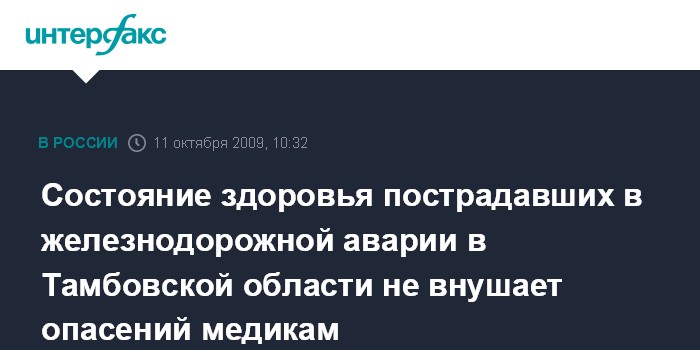 Москва. 11 октября. INTERFAX.RU - 88 человек пострадали, из них восемь были госпитализированы после жесткого соударения пассажирского поезда "Москва-Тамбов" с маневровым тепловозом, произошедшего в субботу под Тамбовом.