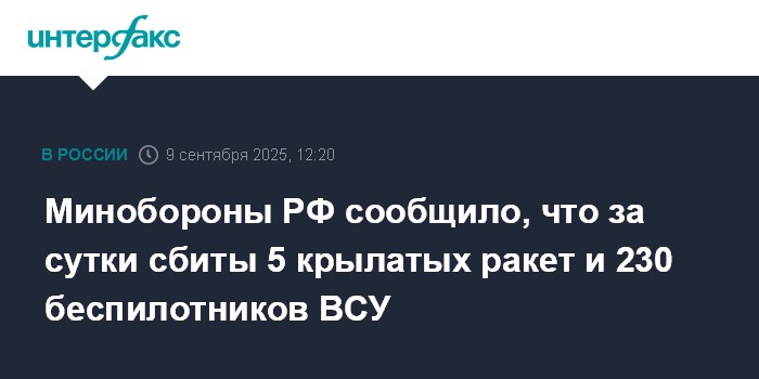 Москва. 9 сентября. INTERFAX.RU - Российские военные сообщили, что средства ПВО за сутки сбили пять крылатых ракет ВСУ и 230 украинских беспилотников.