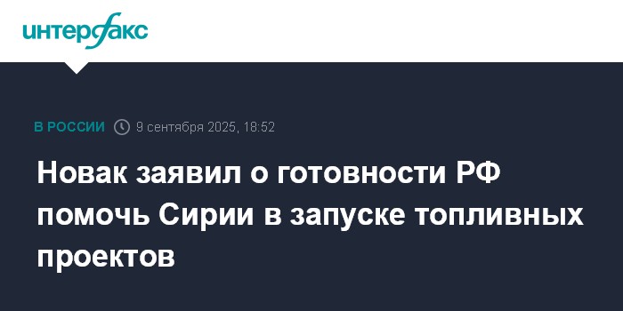 Москва. 9 сентября. INTERFAX.RU - Россия готова оказать новой администрации Сирии содействие в восстановлении энергетического сектора страны и в запуске ряда проектов по обеспечению ее топливом, говорится в сообщении правительства РФ по итогам рабочего визита в арабскую республику вице-премьера Александра Новака.