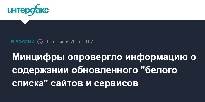 Москва. 10 сентября. INTERFAX.RU - Минцифры РФ заявило о недостоверности появившейся в СМИ информации о расширенном перечне ресурсов и сервисов, которые останутся доступными в периоды ограничений мобильного интернета, в частности, о наличии в нем сайта букмекерской компании.