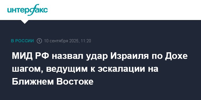 Москва. 10 сентября. INTERFAX.RU - Москва осуждает удар Израиля по территории столицы Катара Дохи, считает его шагом, ведущим к дальнейшей эскалации на Ближнем Востоке, заявили в МИД РФ.