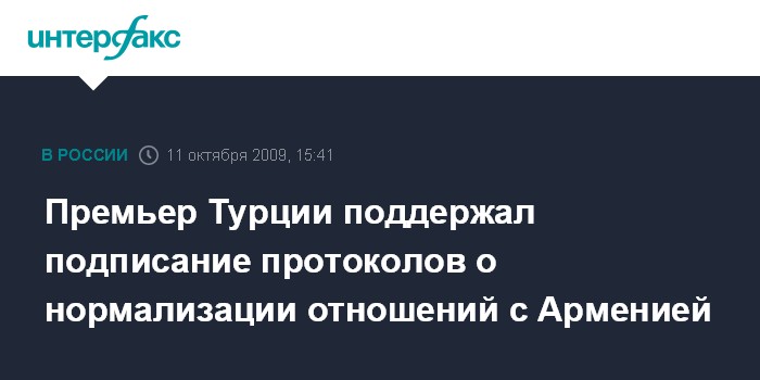 Москва. 11 октября. INTERFAX.RU - Премьер-министр Турции Реджеп Тайип Эрдоган, комментируя подписанные накануне в Цюрихе протоколы о нормализации отношений между Анкарой и Ереваном, подчеркнул важность установления добрососедских отношений с Арменией, сообщают местные СМИ.