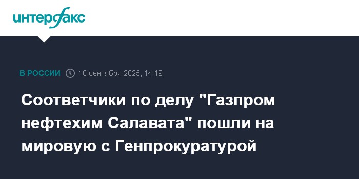 Москва. 10 сентября. INTERFAX.RU - Генеральная прокуратура и соответчики по иску о выводе денежных средств из ООО "Газпром нефтехим Салават" 8 сентября заключили мировое соглашение во Фрунзенском районном суде Петербурга.