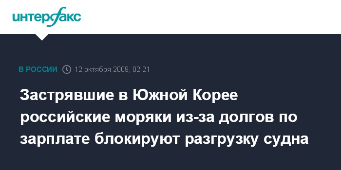 Владивосток. 12 октября. ИНТЕРФАКС-ДАЛЬНИЙ ВОСТОК - В южнокорейском порту Масан российские моряки с лесовоза "Мадеро" отказываются разгружать судно, требуя полного погашения долгов по зарплате, которые составляют около $60 тыс.