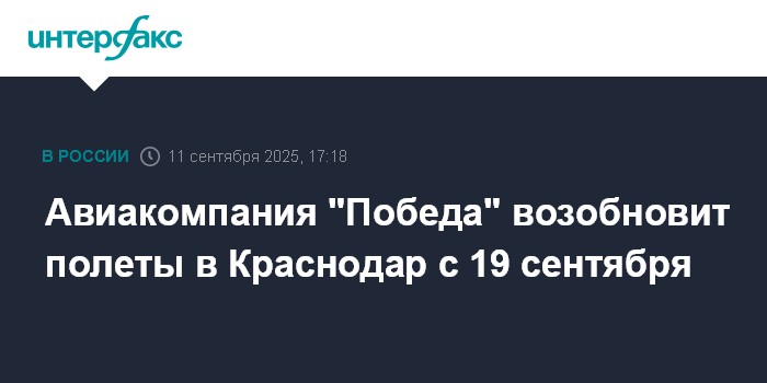 Москва. 11 сентября. INTERFAX.RU - Авиакомпания "Победа" объявила, что возобновит полеты из Москвы в Краснодар с 19 сентября. Рейсы будут выполняться из аэропорта "Внуково".