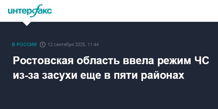 Москва. 12 сентября. INTERFAX.RU - В Ростовской области режим чрезвычайной ситуации введен в Волгодонском, Кагальницком, Песчанокопском, Родионово-Несветайском и Тацинском районах из-за почвенной засухи, говорится в опубликованном распоряжении врио губернатора региона Юрия Слюсаря.