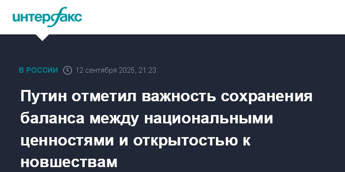 Москва. 12 сентября. INTERFAX.RU - России нужно стремиться к балансу между сохранением национальных ценностей и открытостью к новшествам, способствующим прогрессу, заявил президент РФ Владимир Путин.