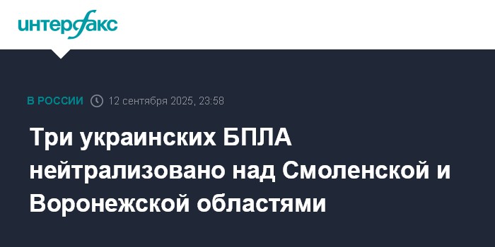 Москва. 12 сентября. INTERFAX.RU - Минобороны России сообщило, что с 21:00 до 23:00 по Москве пятницы средства ПВО перехватили и уничтожили три украинских беспилотника над Смоленской и Воронежской областями.