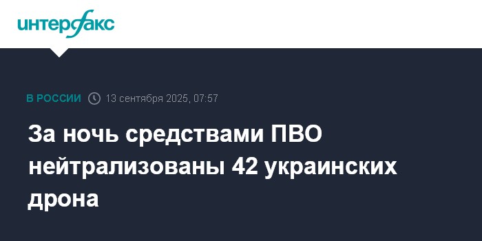 "В течение прошедшей ночи с 23.00 по Москве 12 сентября до 06.00 13 сентября дежурными средствами ПВО перехвачены и уничтожены 42 украинских беспилотных летательных аппарата самолетного типа", - говорится в сообщении.